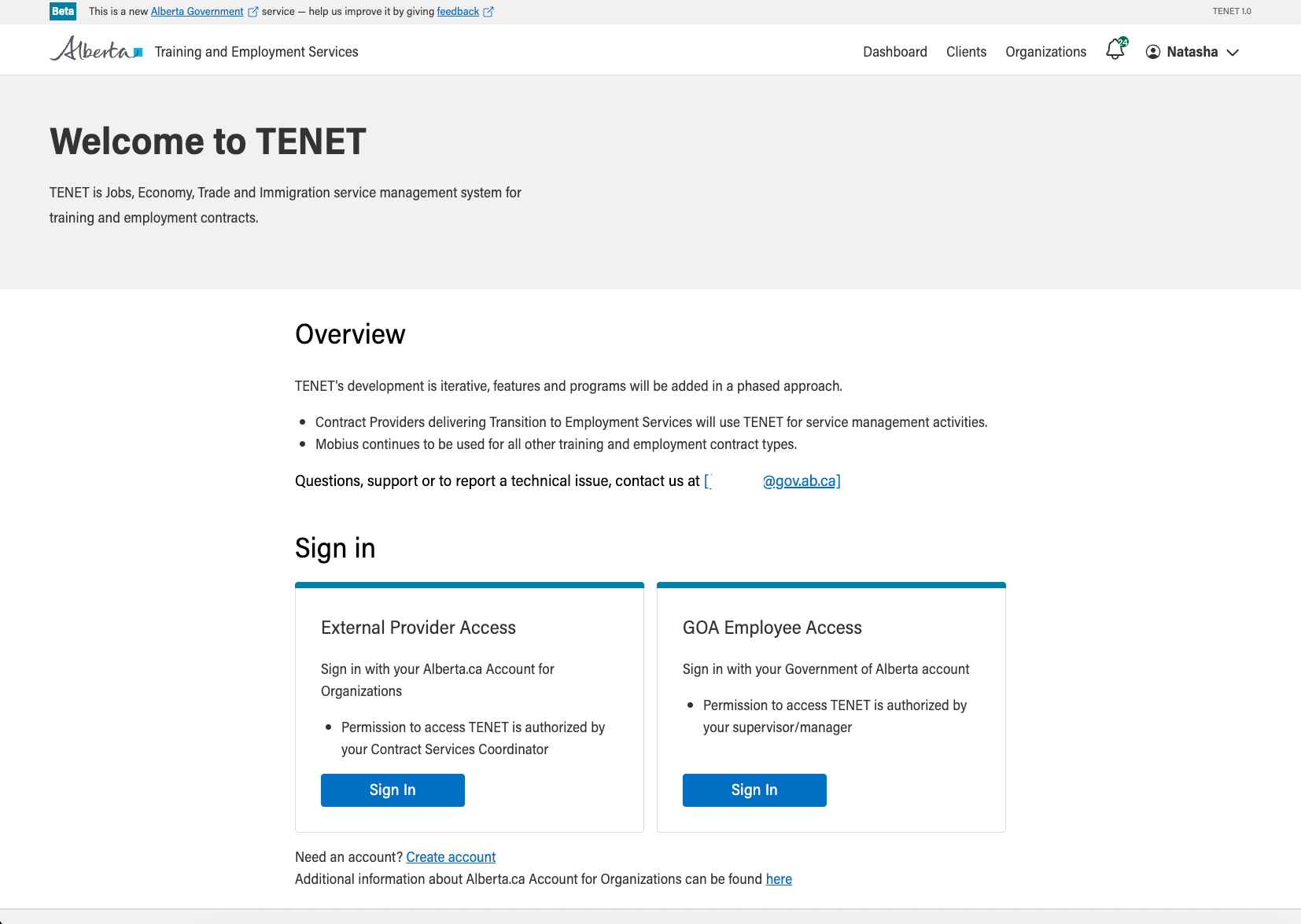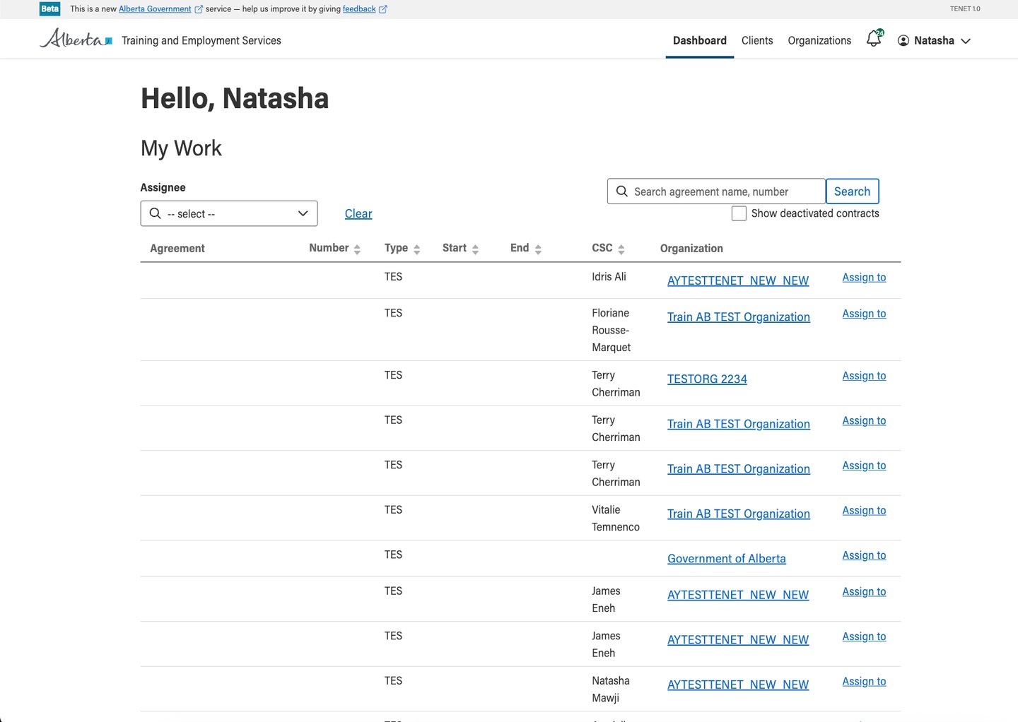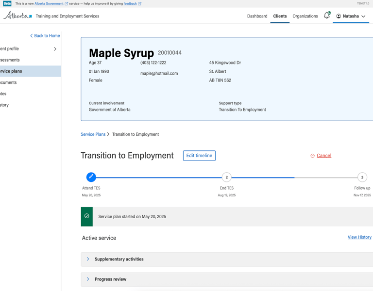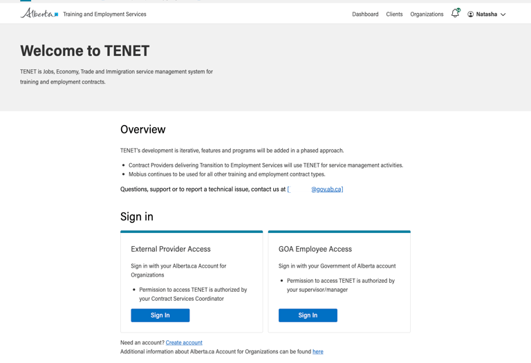TENET 1.0 (Training and Employment Network Enterprise Tracking) was designed as an in-house solution to simplify workflows for the 235 users, reduce operational risk, and give the government greater control over maintenance, scalability, and long-term costs. It caters to approx. 4500 participants/clients in programs annually.